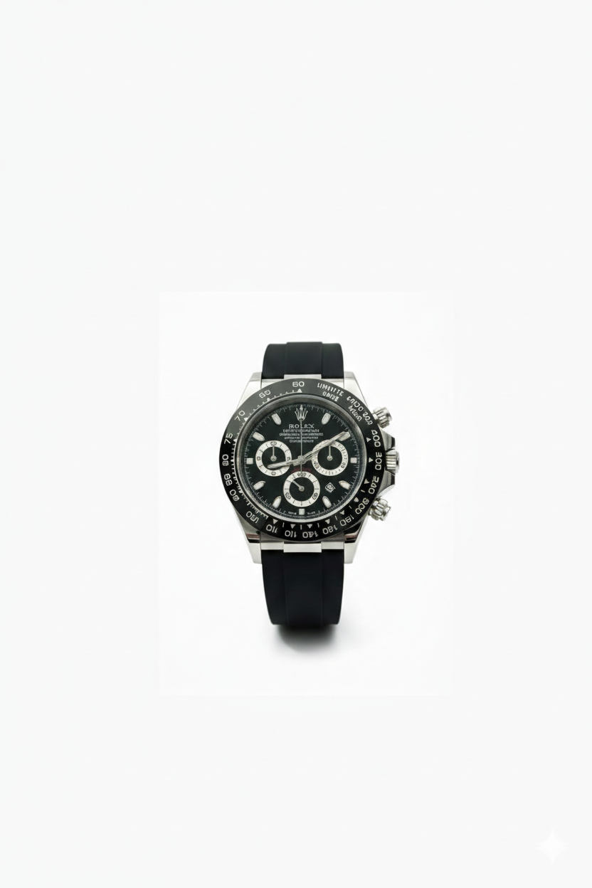 ​Crafted with a robust stainless steel case and a high-tech black tachymetric scale bezel, this watch is paired with a premium black Oysterflex-style rubber strap. This combination provides the durability of a metal bracelet with the flexibility and comfort of an elastomer strap. Driven by a high-precision movement, it ensures split-second accuracy for every journey.